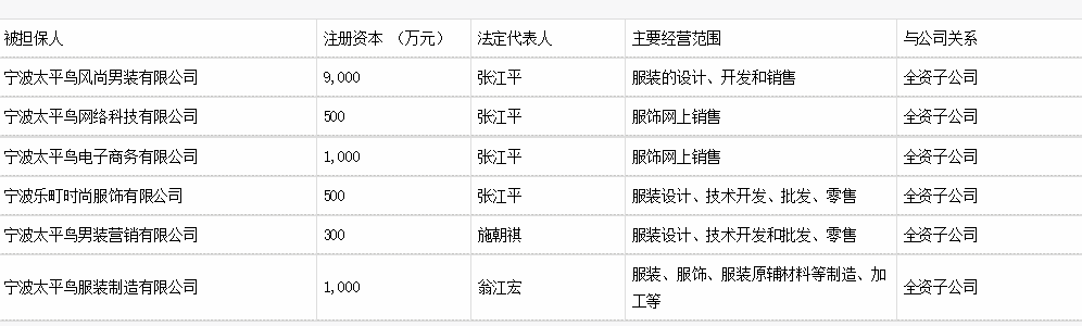 公告显示被担保人分别为宁波太平鸟风尚男装有限公司、宁波太平鸟网络科技有限公司、宁波太平鸟电子商务有限公司、宁波乐町时尚服饰有限公司、宁波太平鸟男装营销有限公司、宁波太平鸟服装制造有限公司等。