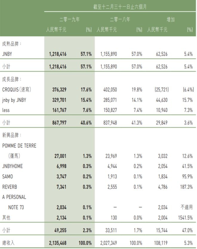 根据公告,成熟品牌JNBY上半财年营收增长5.4%至12.18亿元,占总收入的57.1%。